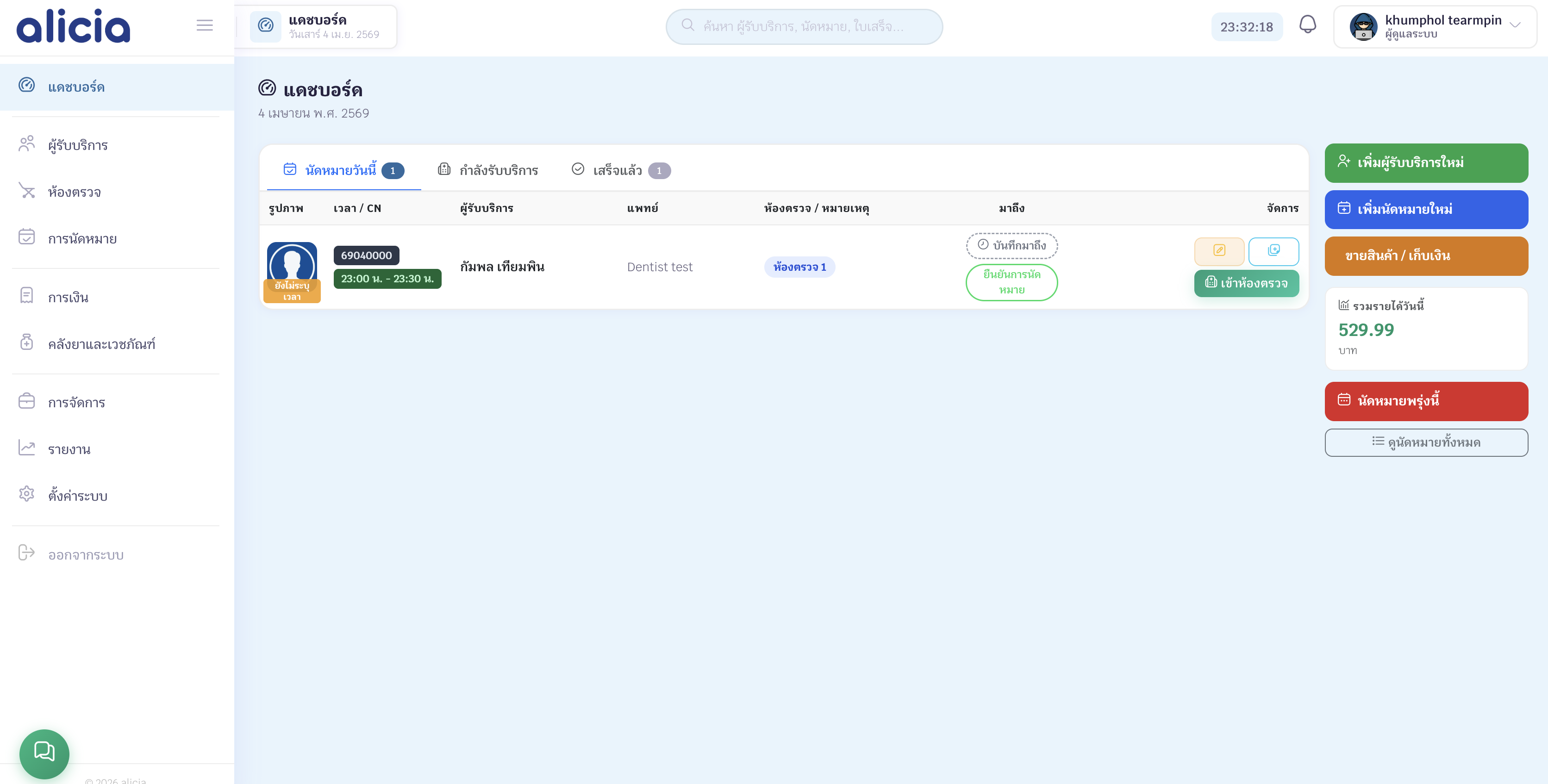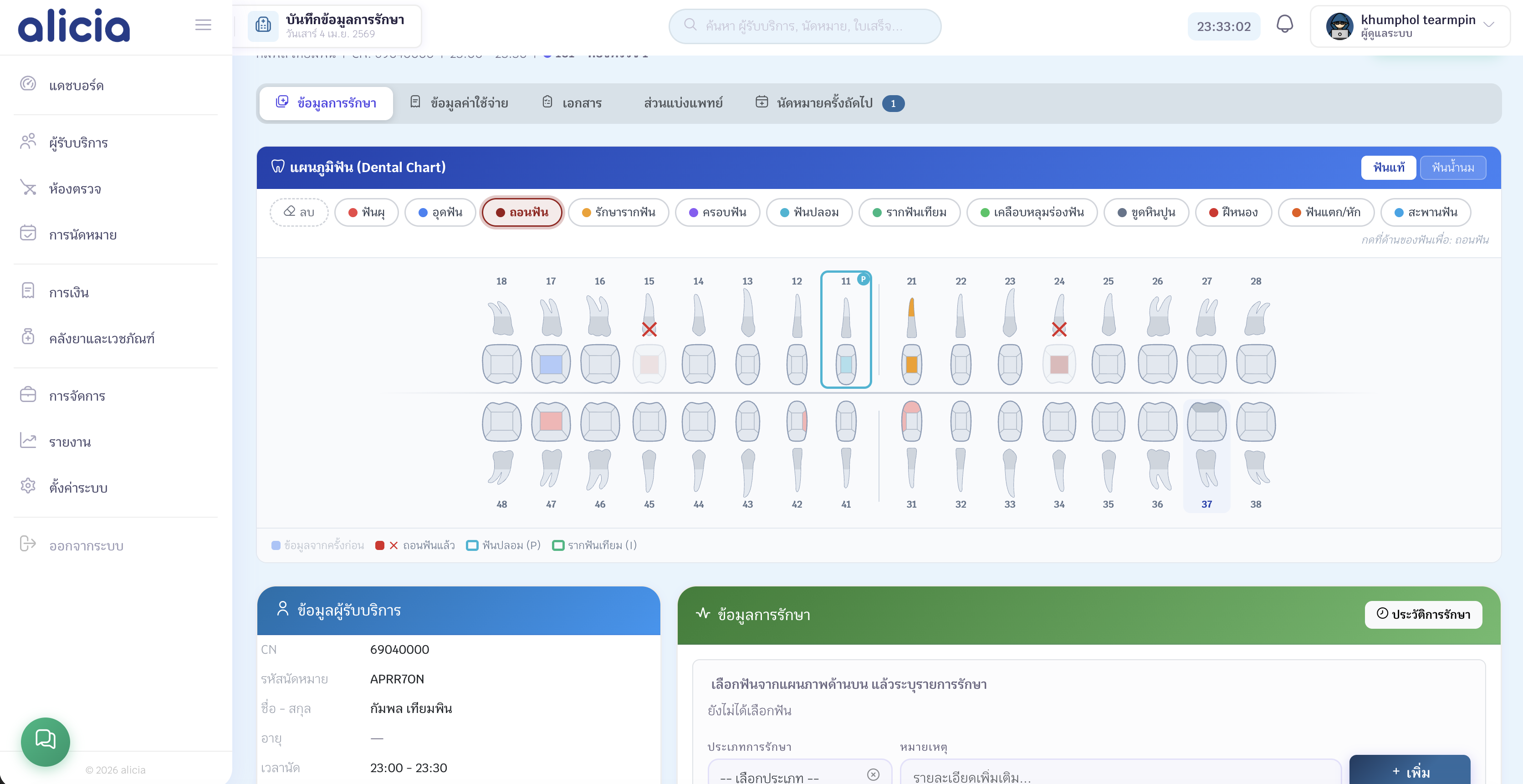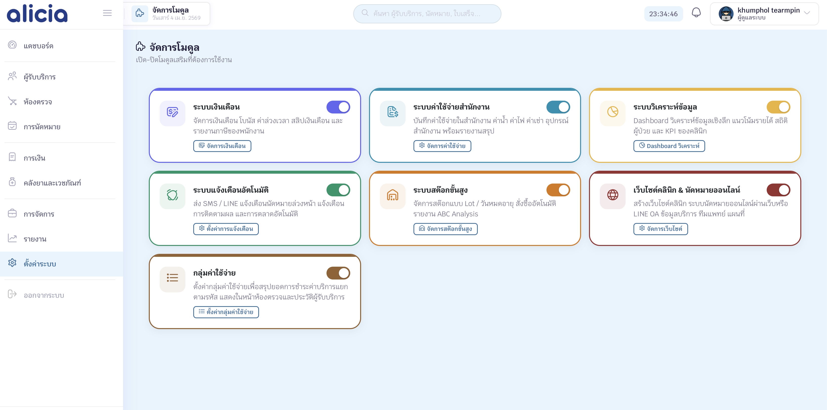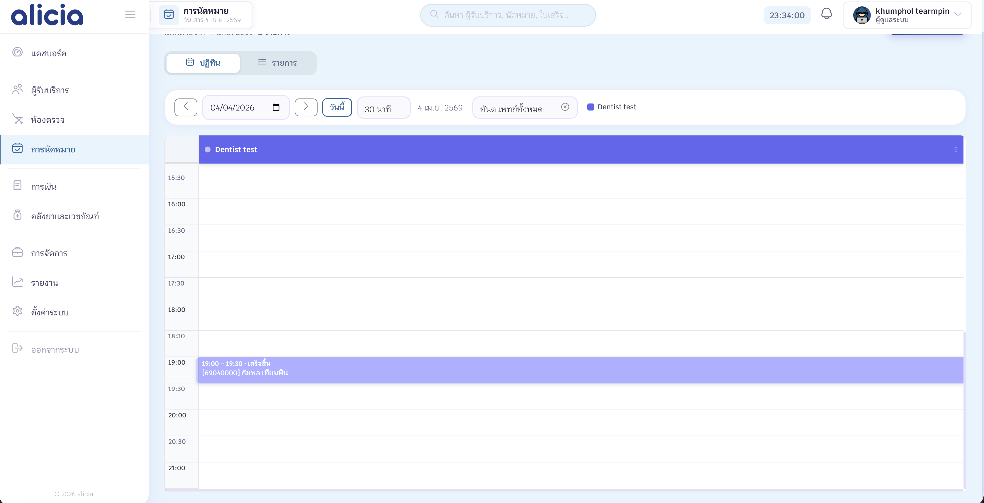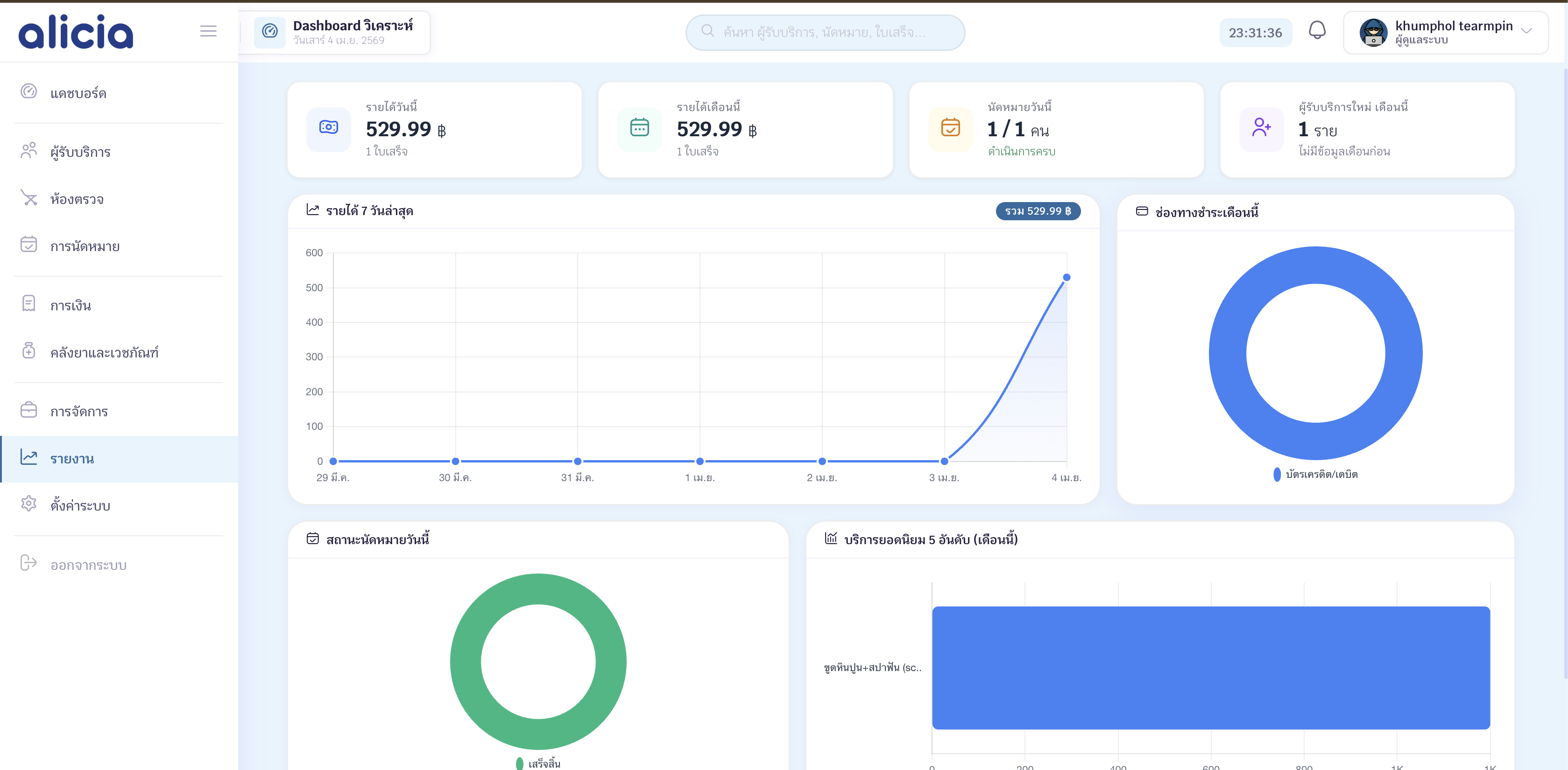 Alicia AI คือระบบบริหารจัดการคลินิกทันตกรรมแบบครบวงจร ออกแบบมาเพื่อช่วยให้ทีมคลินิกจัดการนัดหมาย บันทึกการรักษา ออกใบเสร็จ จัดการคลังยา และติดตามรายได้ได้อย่างง่ายดายในระบบเดียว รองรับการใช้งานหลายภาษา (ไทย/อังกฤษ) พร้อมระบบสิทธิ์ผู้ใช้ตามบทบาท